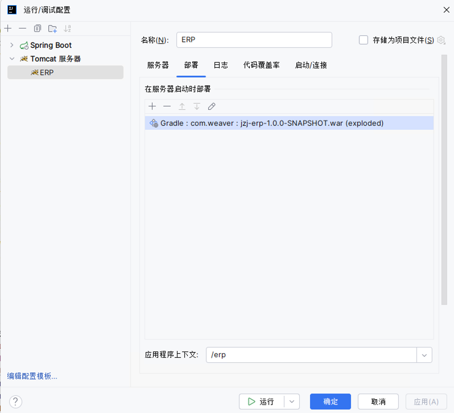 设置完基础信息后可以在部署的Tab页中部署需要启动的服务,并且设置应用的上下文